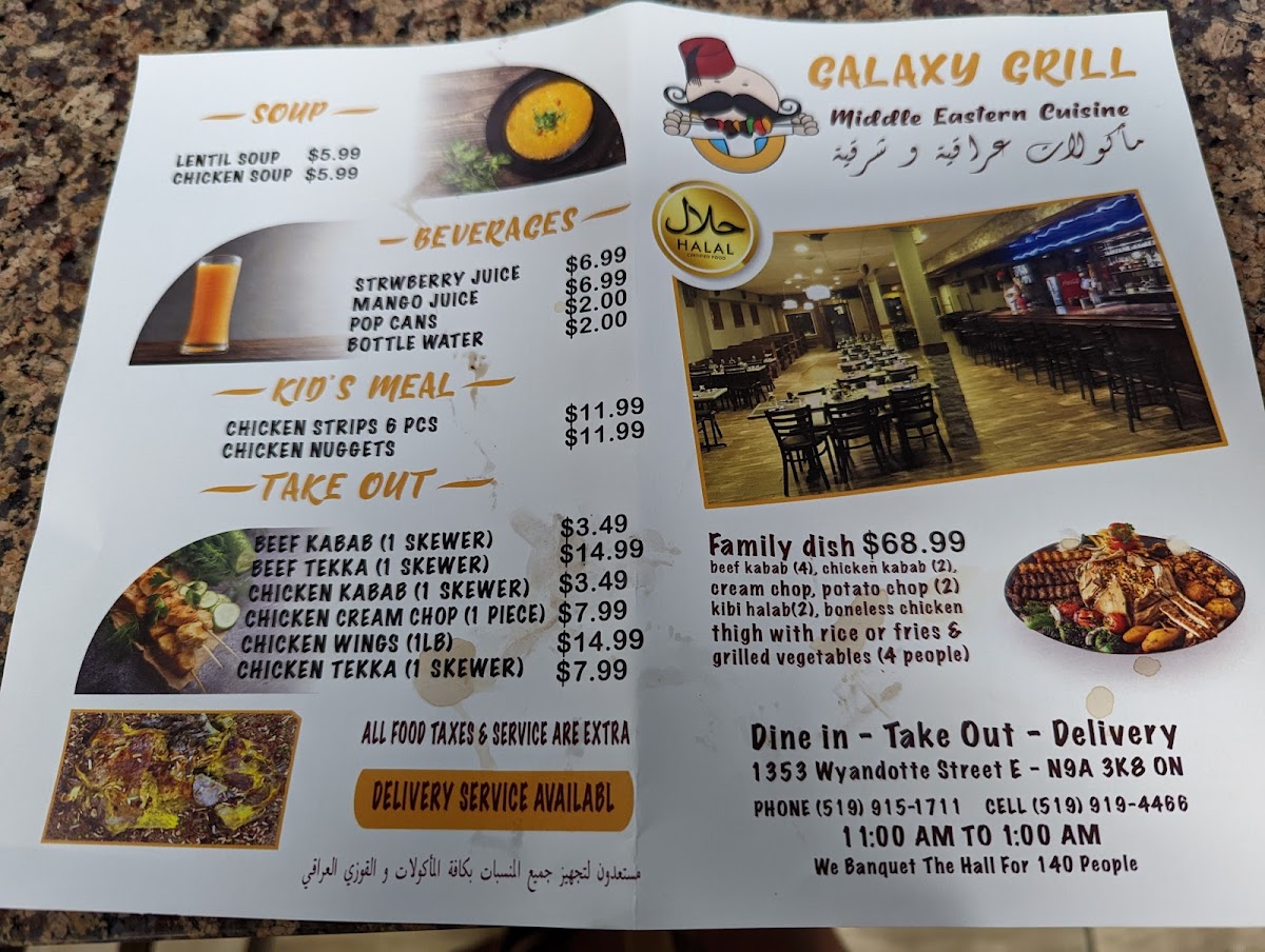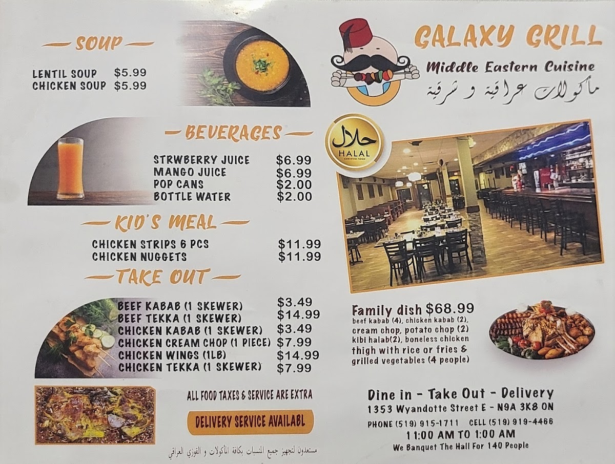 For those interested in takeout, Galaxy Grill offers individual items like Beef Tikka (1 Pc), Chicken Wings (1 Lb), Chicken Kabob (1 Pc), Chicken Tikka (1 Pc), and Beef Kabob (1 Pc), ideal for a quick and easy meal at home or on the go.